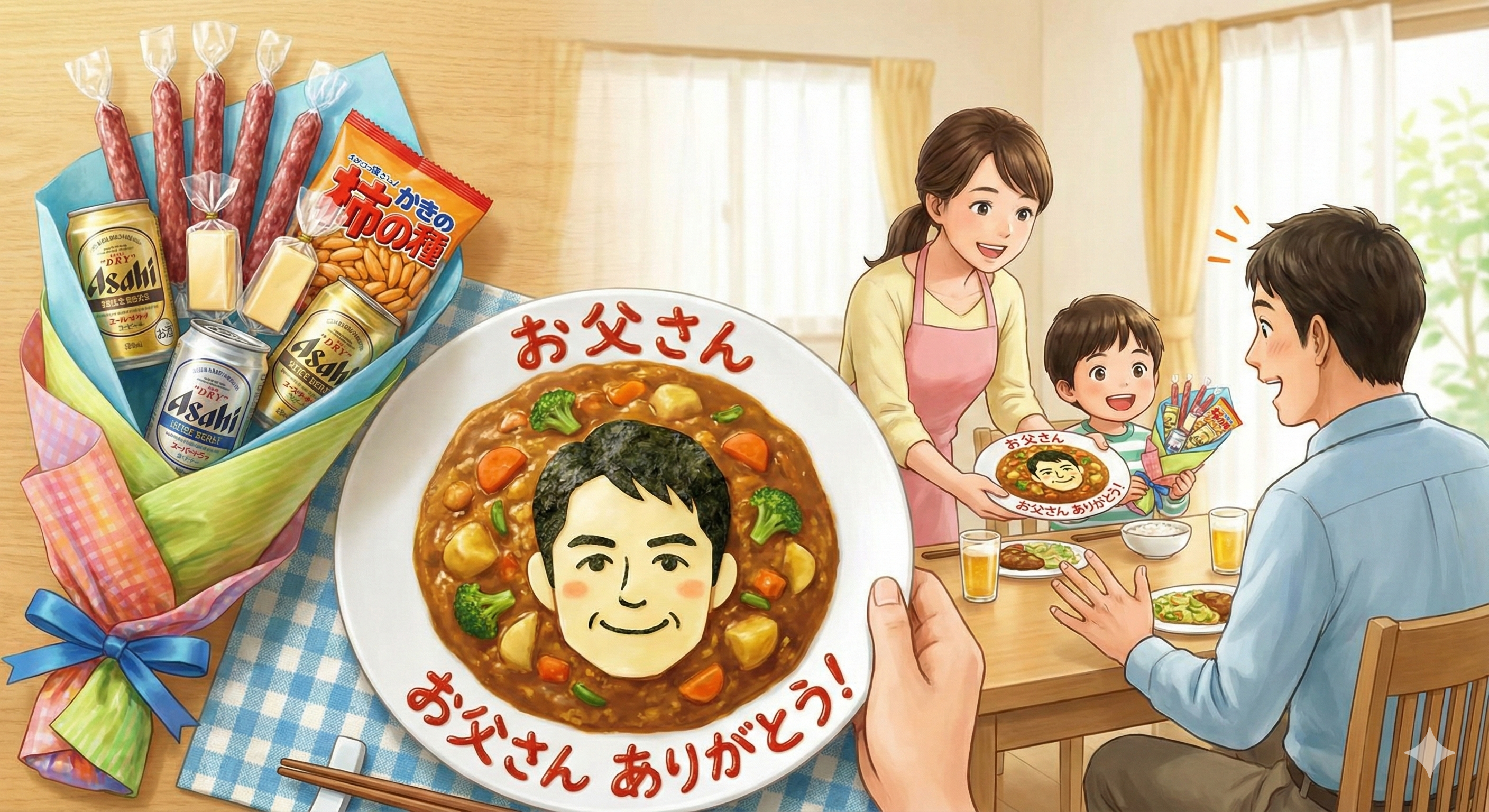 - 似顔絵料理:カレーやオムライスの具材やケチャップで、お父さんの顔を描きます。