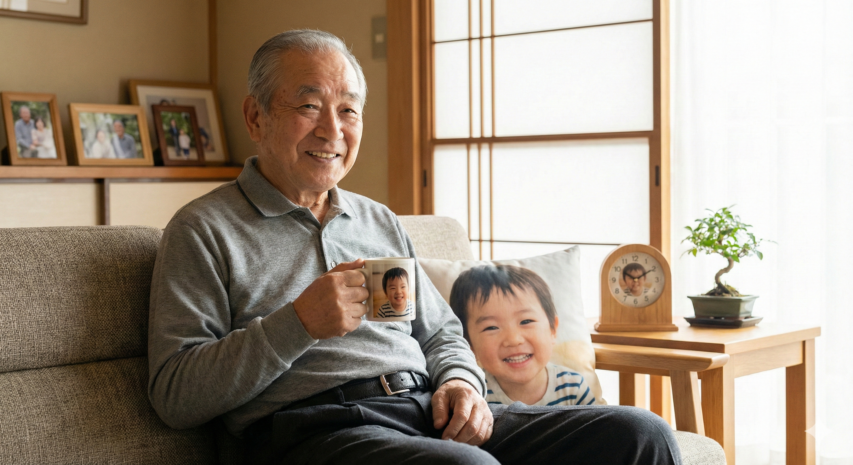 3. 孫が大好きな父へ:「写真入りマグカップ・時計・クッション」