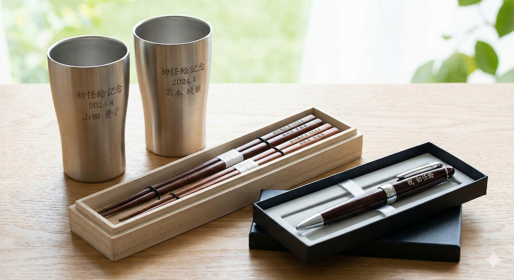 仕事で使える高級ボールペンや、夫婦で使える名入れタンブラー・夫婦箸などが選ばれています。「〇年〇月 初任給記念」といった刻印を入れれば、世界に一つだけの宝物になります。