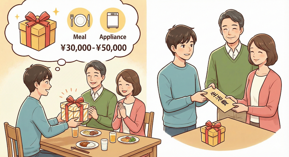 これまでの養育費への感謝に加え、「これからもお世話になります」という意味を込めて、3万円〜5万円ほどの予算で食事に連れて行ったり、家電を贈ったりするケースが一般的です。