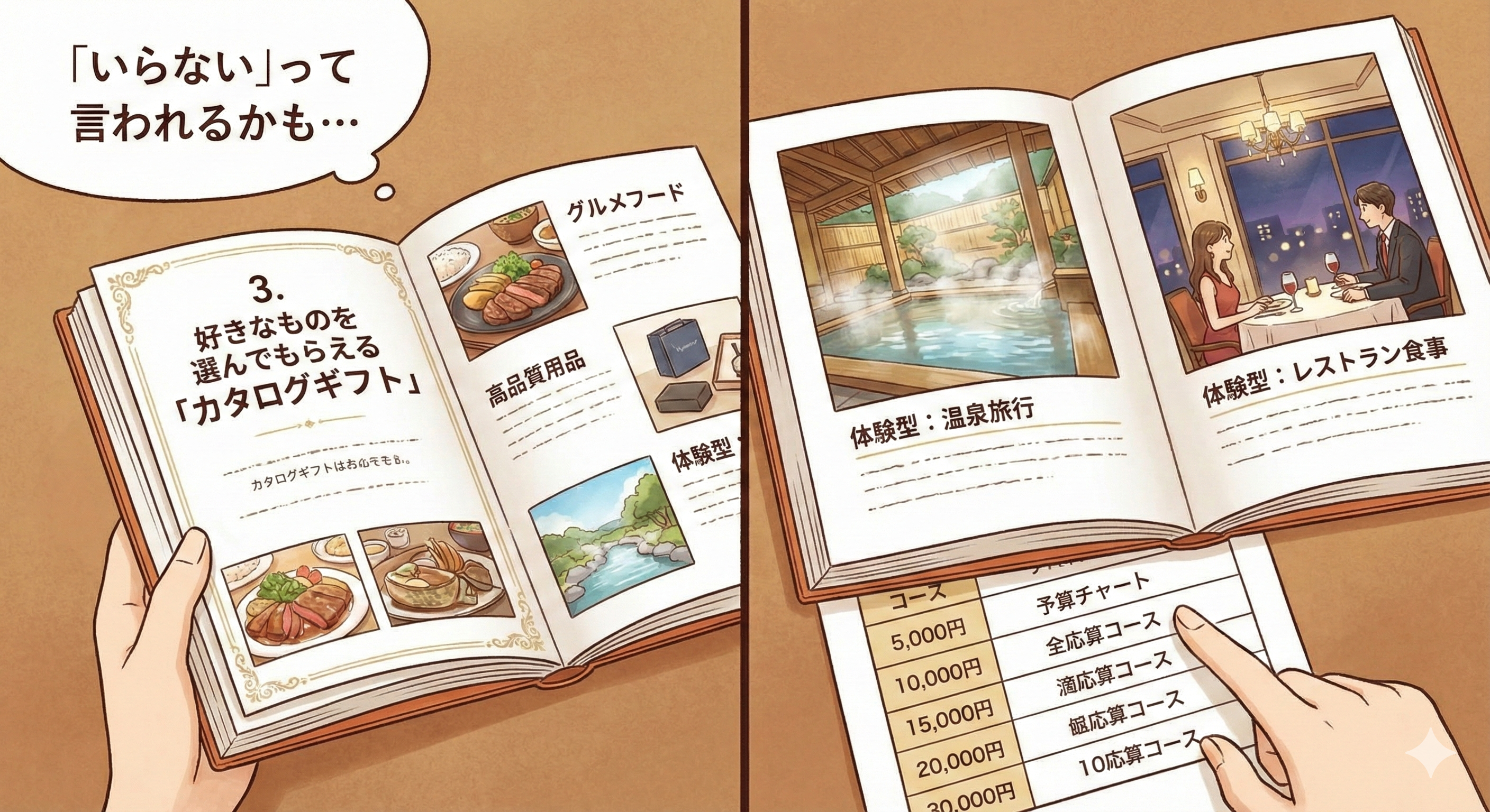 最近では、モノだけでなく「温泉旅行」や「レストランでの食事」が選べる体験型カタログも充実しています。予算に合わせてコースを選べるため、金額調整がしやすいのもメリットです。