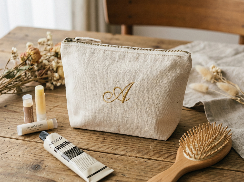 環境に配慮したオーガニック素材のポーチに、ゴールドの糸でイニシャル刺繍を施したセットなども、サステナブルを意識する今のトレンドにぴったりと合致しています。