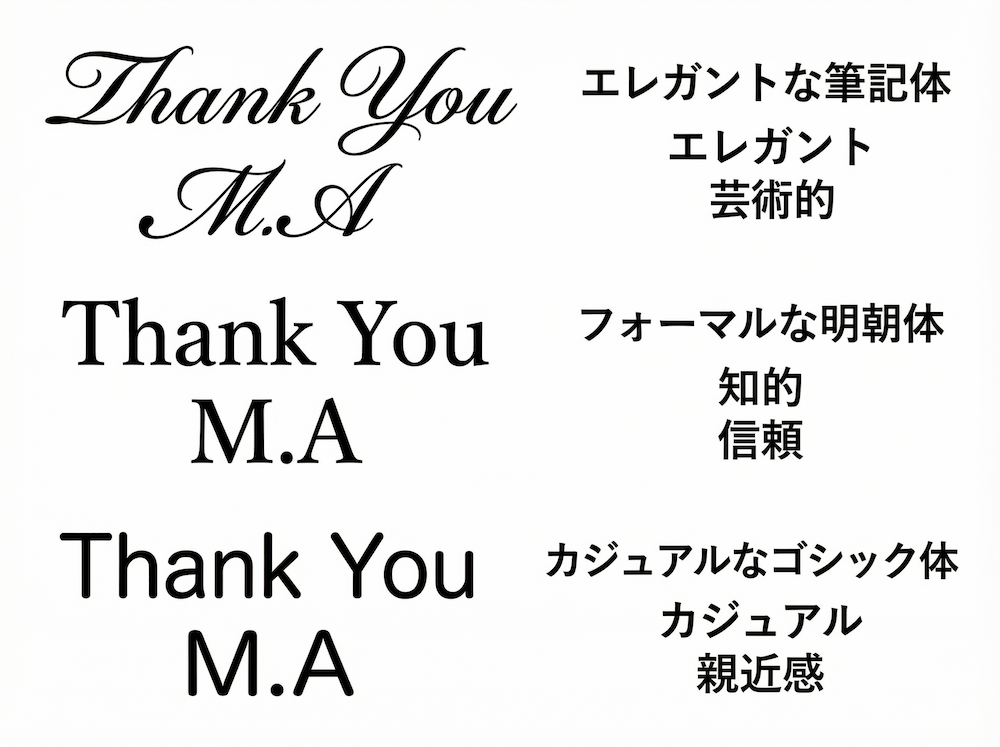 ・セリフ体(明朝体など):知的でフォーマル、落ち着いた大人の印象を与えたい時にぴったりです。