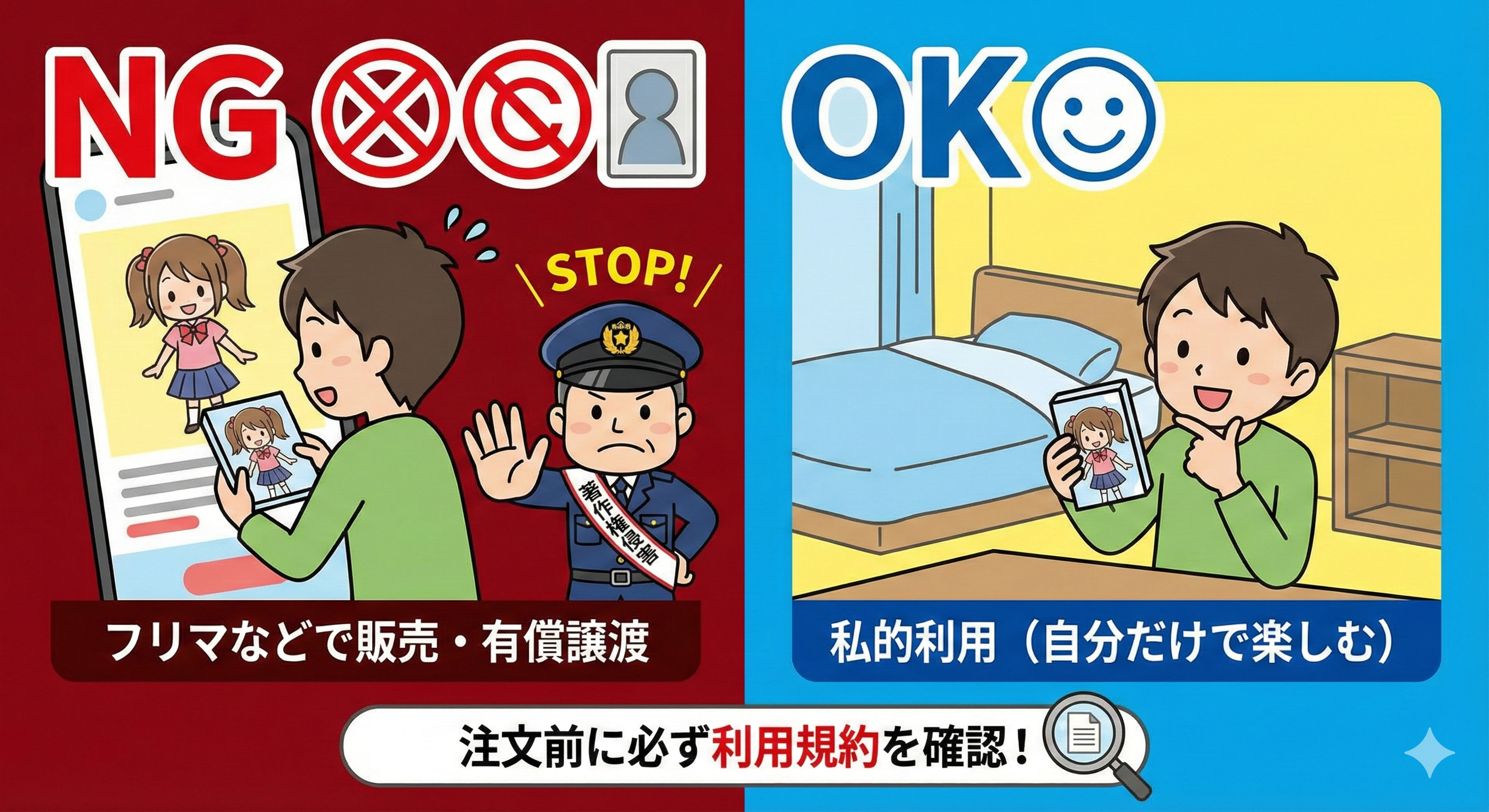 基本的に、芸能人の写真やアニメのキャラクターを使用したグッズ作成は、「私的利用(自分や家族だけで楽しむ範囲)」に限られます。作成したグッズをフリマアプリで販売したり、SNSで有償譲渡を募ったりする行為は権利侵害となり、法的なトラブルに発展する可能性があります。