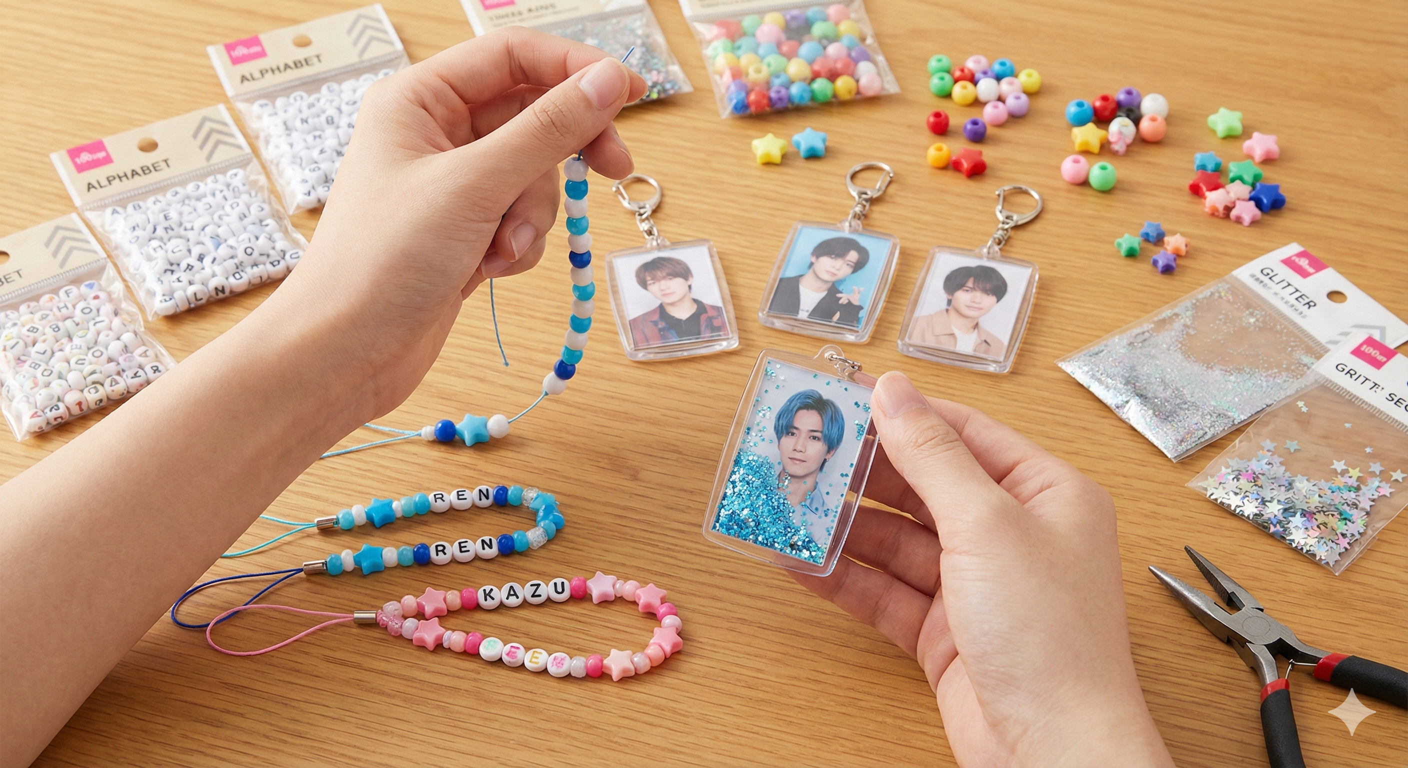 - ビーズストラップ: アルファベットビーズで推しの名前を入れ、推し色のビーズで装飾します。