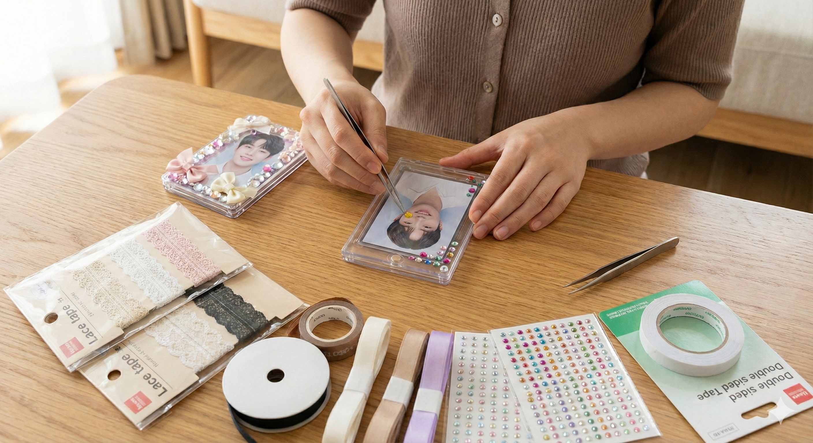 - 作成のポイント:推しのイメージカラー(メンカラ)に合わせたシールを選び、写真の枠を囲むように配置します。レースシールやラインストーンを重ねることで立体感が生まれます。