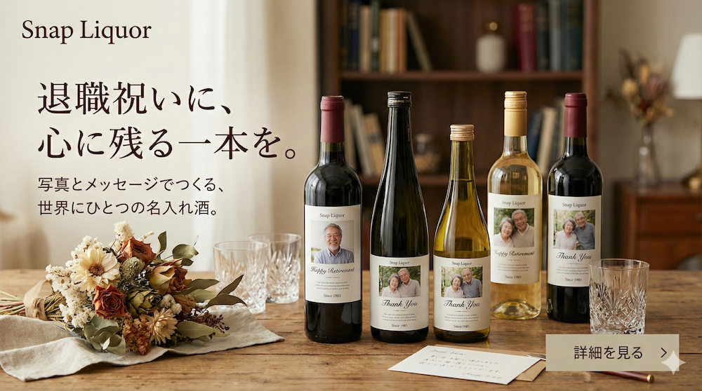 - ワイン:入社した年の「ヴィンテージワイン(生まれ年ワイン)」を贈るのも、退職祝いならではの粋な演出です。